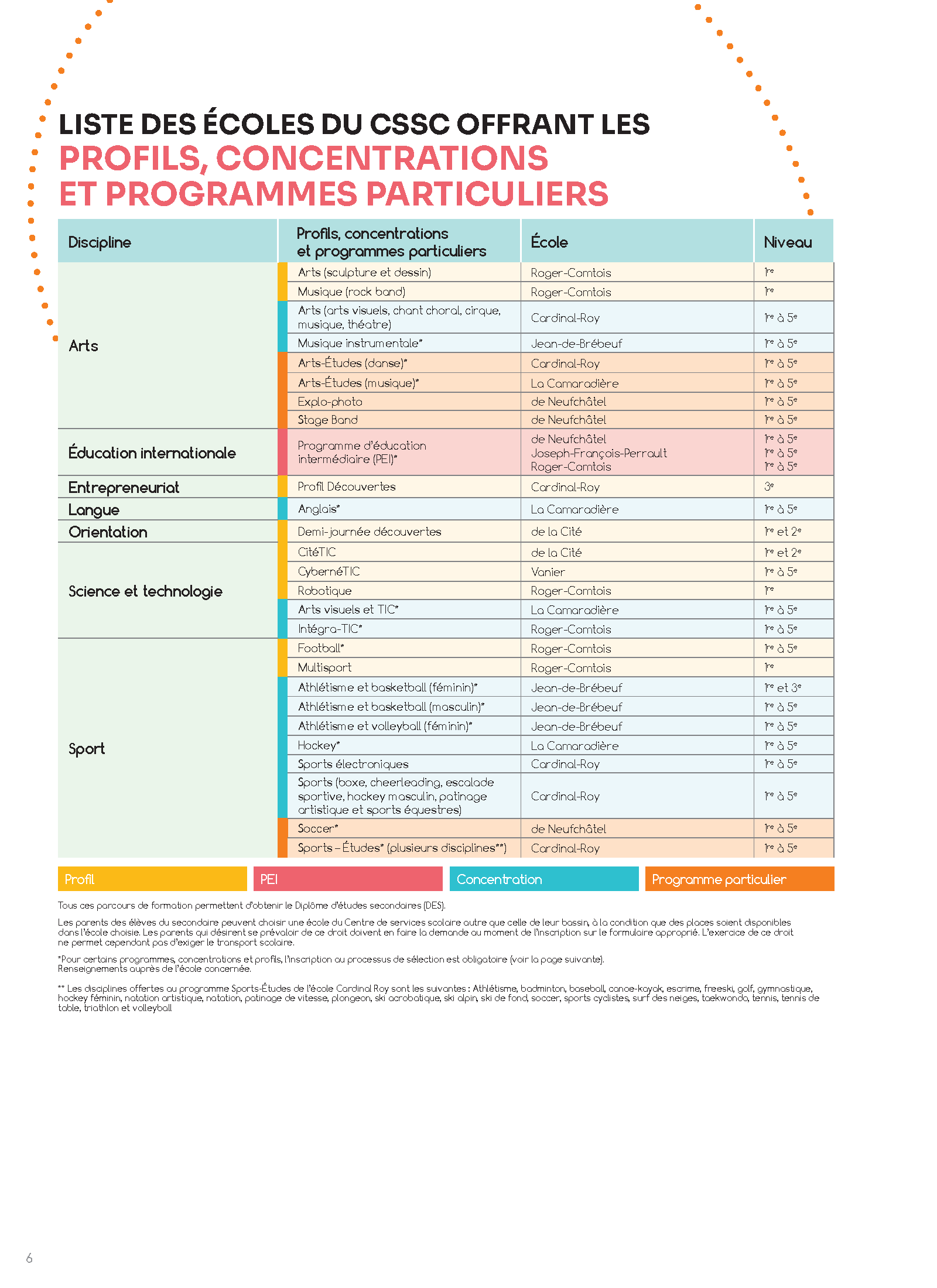 - Les programmes Sports-Études et Arts-Études (danse) de l’école Cardinal-Roy; le programme Arts-Études (musique) à l’école secondaire La Camaradière et le programme soccer de l’école secondaire de Neufchâtel